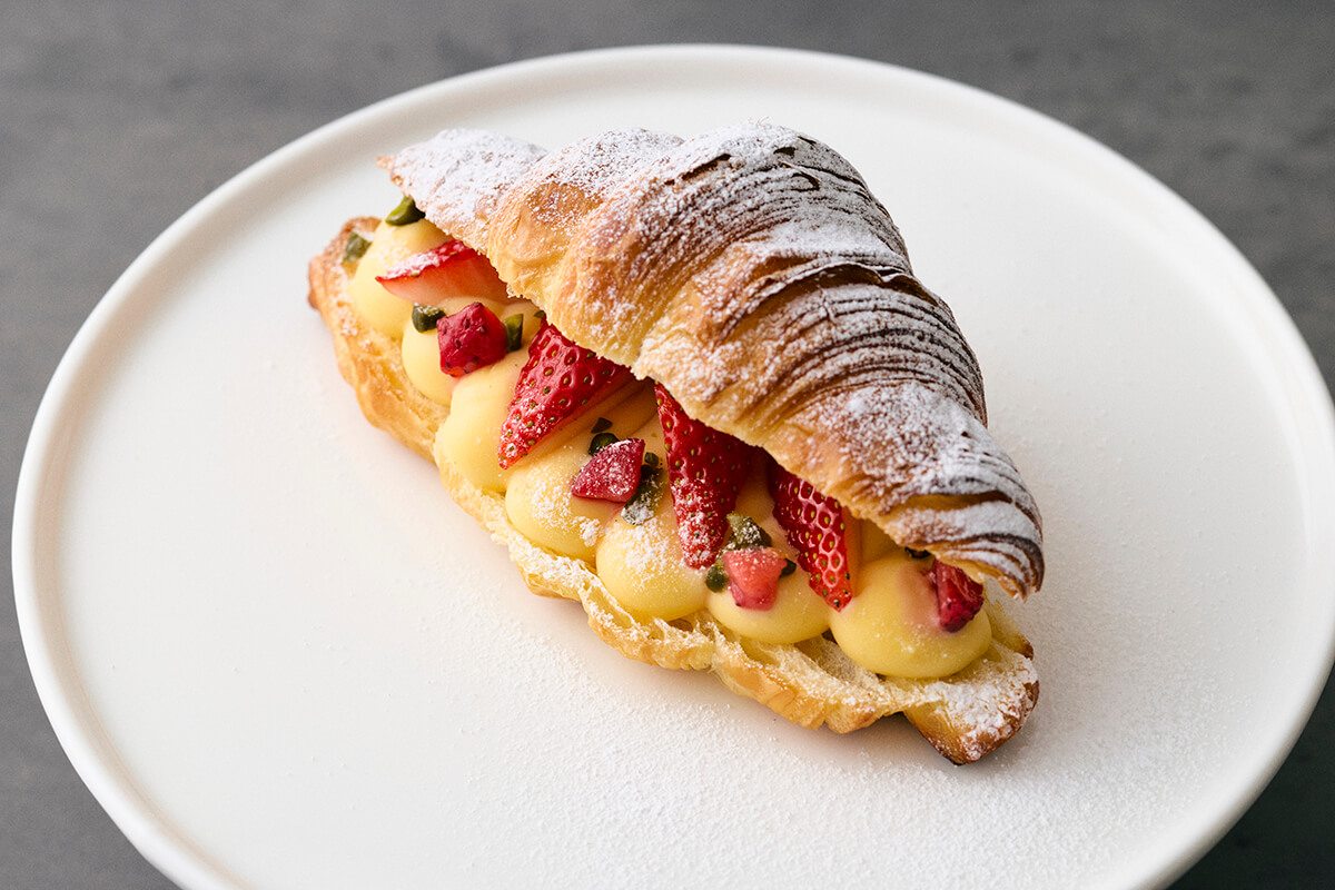 クロワッサン生地に挟んだカスタードクリームは、Comme’N TOKYOと同じ卵感たっぷりのクリームを使用し、米粉を加えることで、なめらかな口当たりに仕上げられている。苺の甘酸っぱさとクリームのやさしい甘さが調和し、小さなお子さまからご年配の方まで、幅広い世代が楽しむことができる。