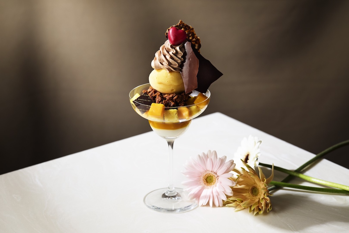 層仕立てのパフェは、やさしい口当たりの杏仁豆腐をグラスの底に配し、果実の甘みと酸味が特徴のバナナ・マンゴーパッションクーリ、しっとりとしたブラウニーとヒマラヤンブレンドティーガナッシュを重ねた。さらに板チョコやチョコレートカード、香ばしいプラリネフィアンティーヌで食感にアクセントを加え、トップにはライムの皮でマリネしたマンゴーとパイナップル、果実味あふれるマンゴーパッションソルベをあしらった。仕上げにチョコレートシャンティ、チュイルカカオと2種の板チョコ(ノワール&ミルク)とともに、ピエール マルコリーニを象徴する赤いハート「クール フランボワーズ」を添えている。